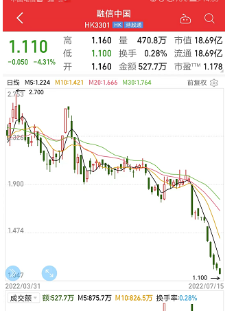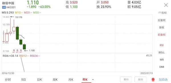 只是,时间这个刺客是最无情的,截至2022年7月15日,融信中国股价创历史新低,仅有1.11港元。如果按年看,之前最高达到过13港元……人生简直就是一场过山车走势。
