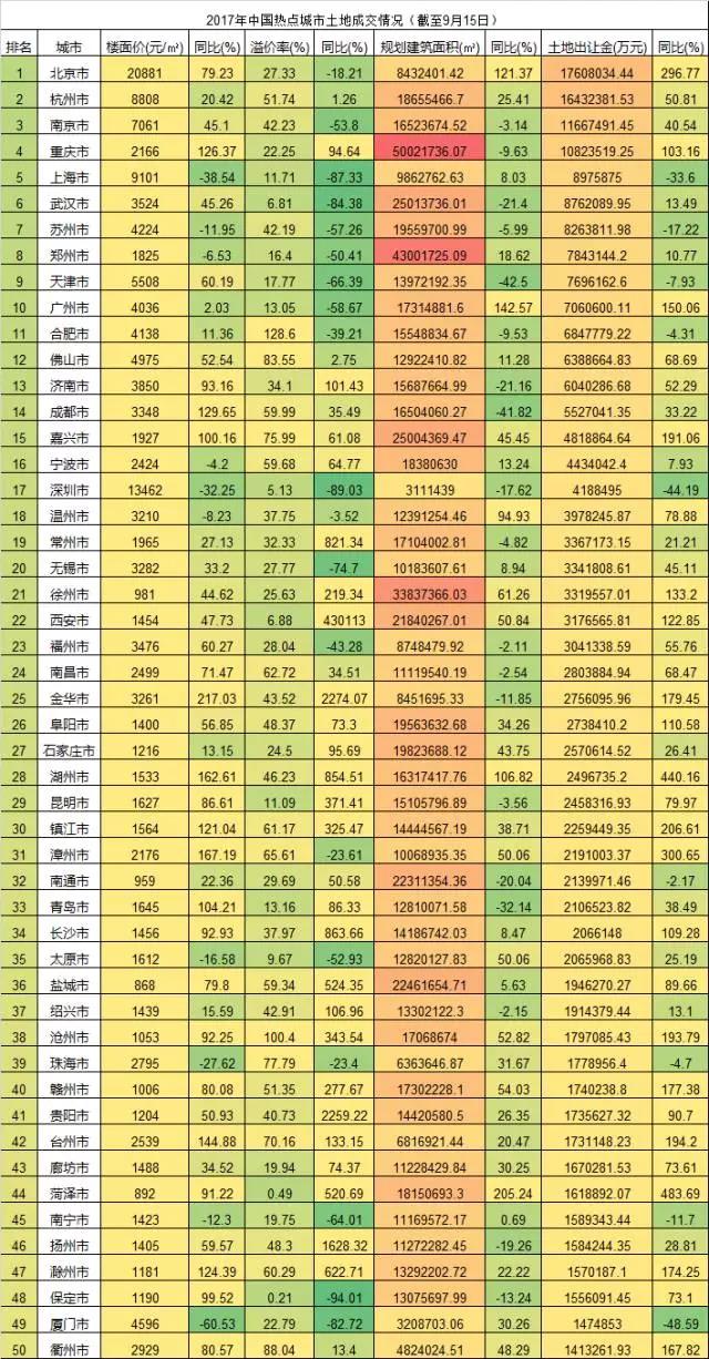 截止2017年9月15日,全国50大热点土地出让城市合计土地出让金金额达到了2.13万亿,相比2016年同期的1.53万亿上涨了38.8%。