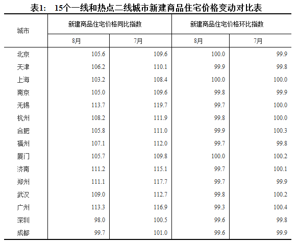 15个一线和热点二线城市新建商品住宅价格环比下降或持平,同比涨幅全部回落: